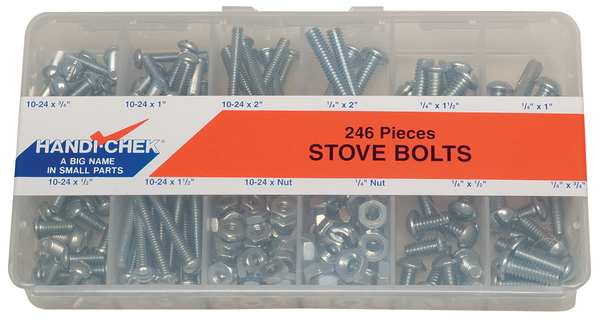 - Price For: Each Driver Size: - System of Measurement: Inch Type: Machine Screw Size: 10-24 to 1/4-20 Includes: Stove Bolts 20 Each 10-24 x 1/2, 3/4, 1, 15 Each 10-24 x 1 1/2, 8 Each 10-24 x 2, 10 Each 1/4-20 x 1/2, 12 Each 1/4-20 x 3/4, 7 Each 1/4-20 x 1, 1/4-20 x 1 1/2, 4 Each 1/4-20 x 2, Hex Nuts 83 Each 10-24, 40 Each 1/4-20 Finish: Zinc Number of Sizes: 12 Head Type: Round Drive Type: Slotted